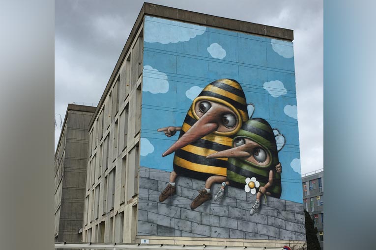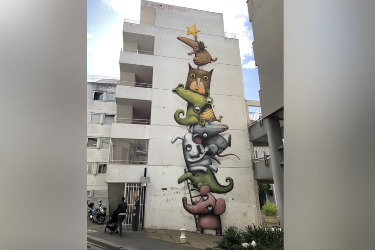 Mais pourquoi “Olibrius” ? Ce terme, peut-être abscons, définit « un individu qui se fait fâcheusement remarquer ». Il s’agit là encore d’une forme d’auto-dérision et tend à illustrer la façon, dont l’artiste s’engage auprès des spectateurs. Que cela soit au travers des toiles que l’on retrouve aussi bien en galerie que dans la rue. Dans son travail, l’artiste raconte des histoires qui peuvent interpeller, voire surprendre, plaire ou déplaire. Le tout avec des personnages aux longs nez, aux yeux écarquillés ou exorbités, aux allures dégingandées, dans des environnements rocambolesques et des scènes chaotiques et captivantes.