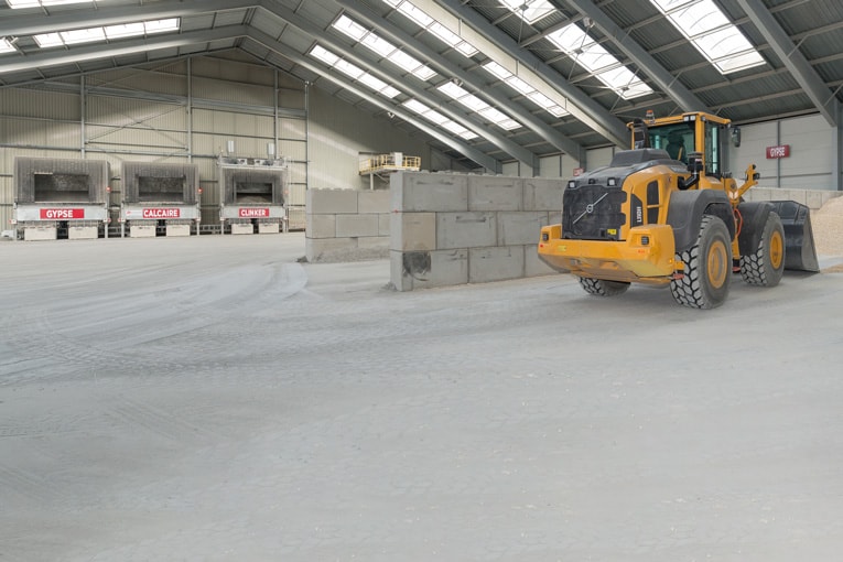 Le pont roulant assure en parallèle l’alimentation du basculeur, dont le rôle est de vidanger, en toute sécurité, les conteneurs dans le hall de stockage des matières premières, via une fosse dépoussiérée. De là, une chargeuse sur pneumatique équipée d’un godet de 4 700 l reprend le clinker pour le déverser dans la trémie d’alimentation dédiée du broyeur.