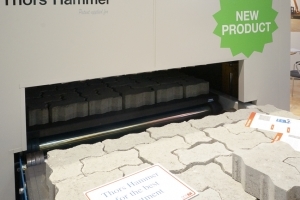La nouvelle machine Thors Hammer produit un vieillissement rapide des nouveaux pavés encore placés sur leurs plateaux.