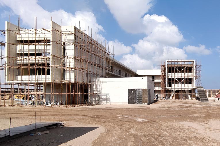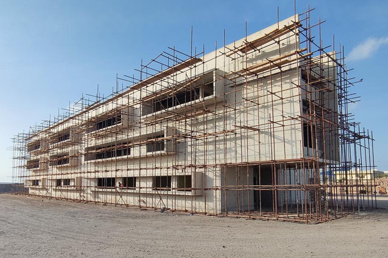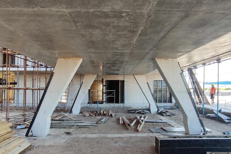 Le béton est produit dans une centrale appartenant à Dji-Fu : le BPE n’existe pas à Djibouti. Mais le résultat obtenu dépasse les attentes du maître d’œuvre. « Notre béton blanc affiche une résistance de l’ordre de 60 MPa ! » Lors de sa fabrication, le matériau est rafraîchi aussi pour pallier les conditions climatiques extérieures. Mi-mars – c’est-à-dire à la sortie de l’hiver – il fait environ 34 °C en journée…