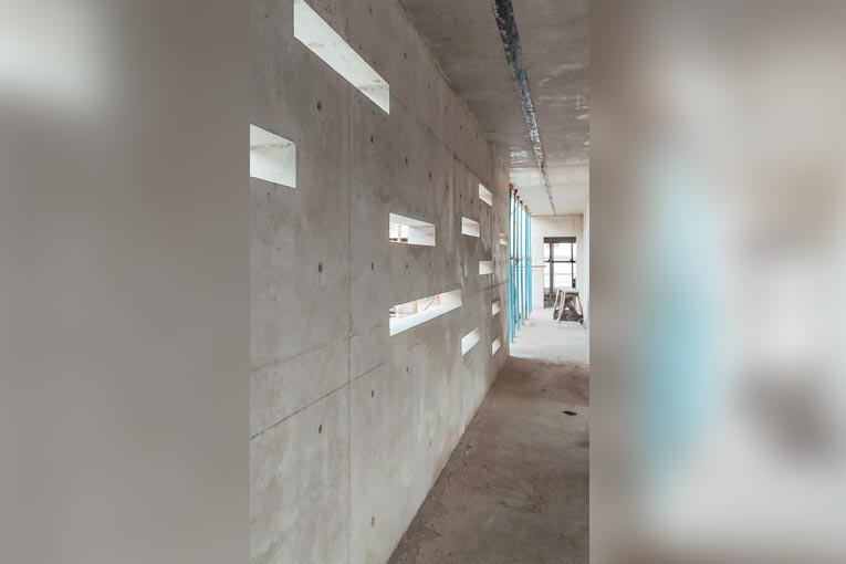 Une des signatures du bâtiment est la présence de larges ouvertures horizontales, s’étirant sur 8,36 m. Là, des cheminées de bétonnage ont été prévues – démolies après durcissement – pour garantir un parfait remplissage de la partie inférieure des voiles. D’autant plus que le béton utilisé était certes fluide, mais pas de type auto-plaçant.