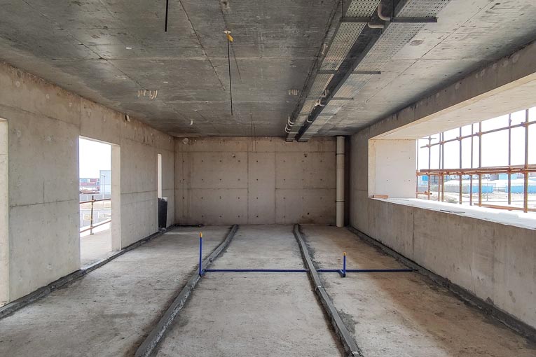 Pour Frédéric Schoeller, le choix du béton pour le projet Transform a été une évidence. Ici, il y a une véritable attente de pérennité. Le Centre doit accueillir et former en permanence 600 élèves à la manutention portuaire. Il n’est donc pas question de reconstruire le bâtiment à intervalles réguliers ! « En plus, le béton, c’est ce que l’on sait faire le mieux », rappelle l’architecte. Et de poursuivre : « L’intéressant dans un projet comme celui-ci est la rencontre. Nous arrivons quelque part et ce que nous demandons n’a jamais été fait avant. A chaque fois, nous apprenons des choses nouvelles. Nous découvrons des méthodes de travail que nous ne connaissions pas. » Le coffrage par niveau complet a été déconcertant pour Frédéric Schoeller. Mais le sérieux de Dji-Fu, à l’écoute des attentes de l’architecte, a permis d’atteindre un résultat parfait.