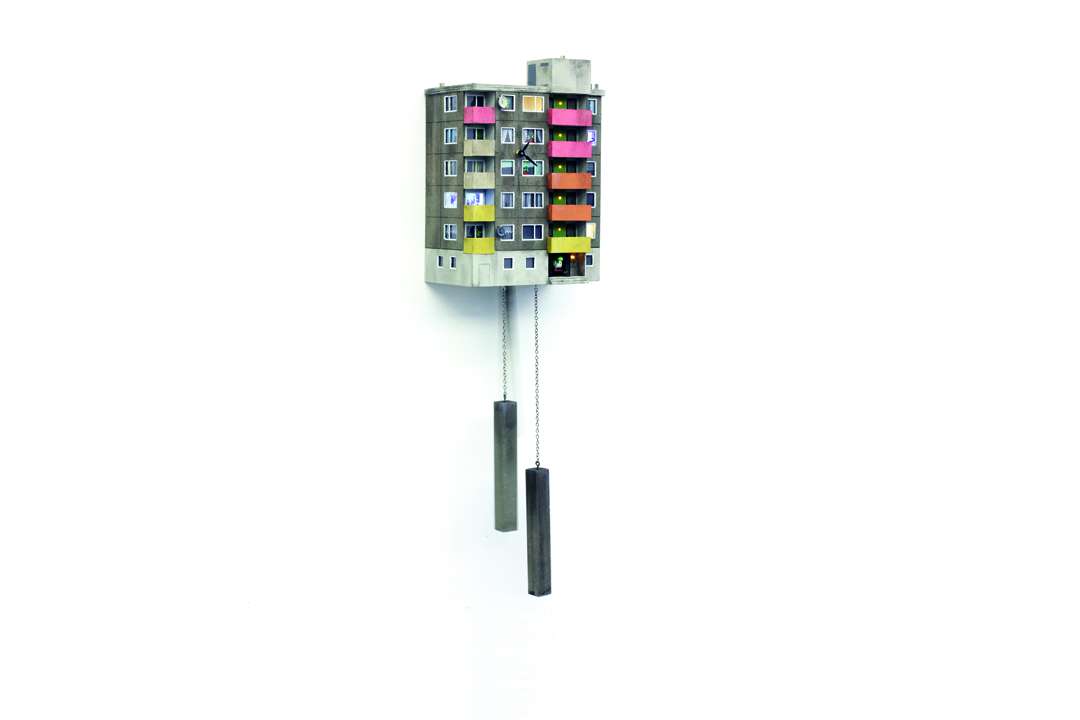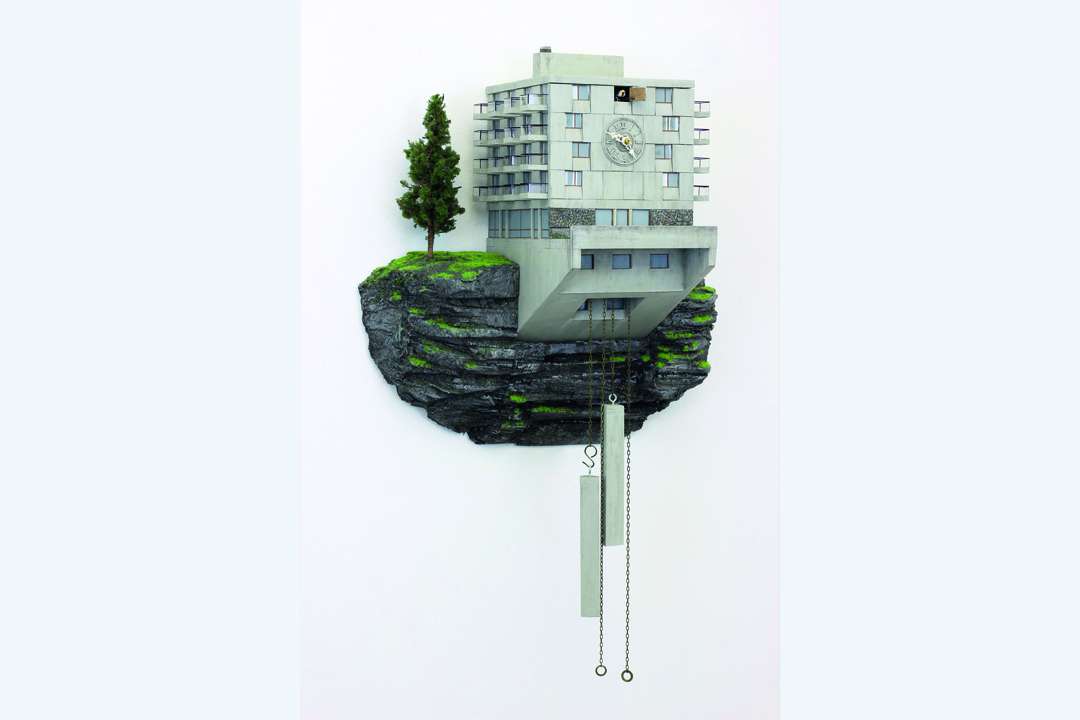 - L’artiste allemand Guido Zimmermann a réalisé toute une série d’horloges à coucou en forme d’immeubles, d’architectures modernes. En béton, mais pas que… [©Guido Zimmermann]