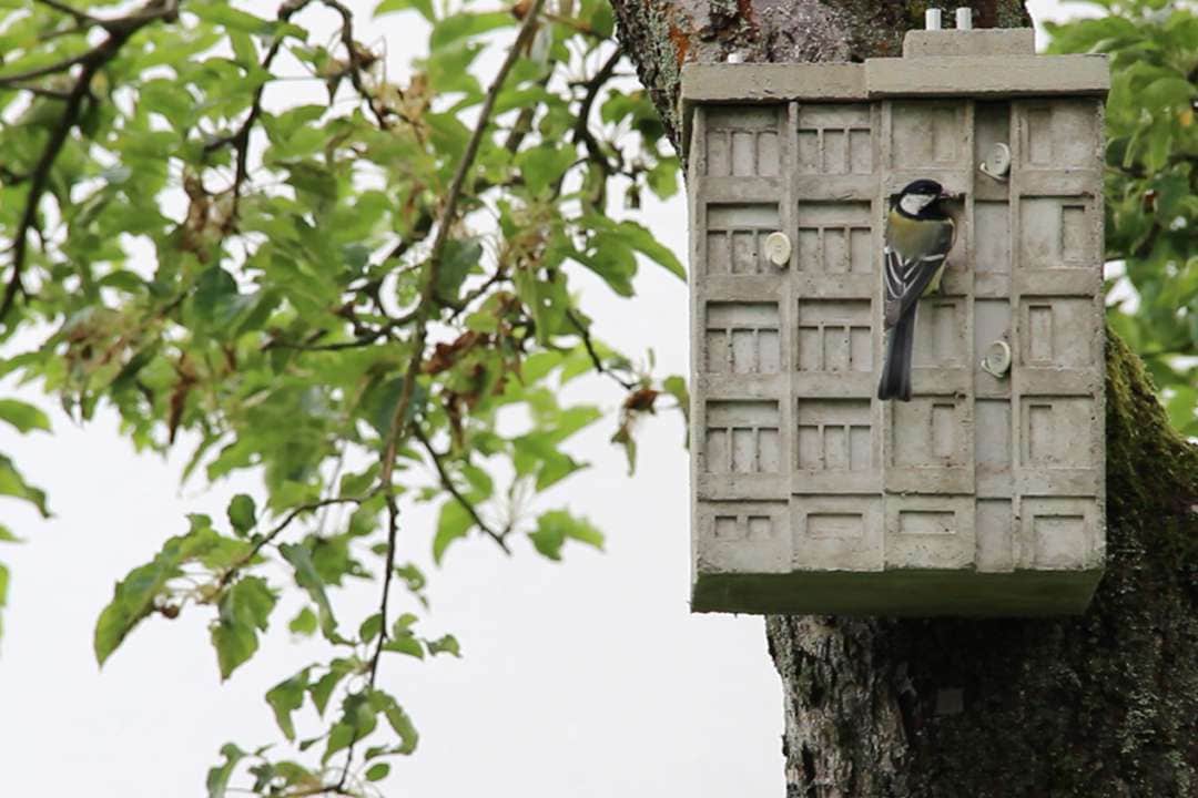 De plus, Guido Zimmermanna élargi sa série de pendules avec quelques maisons à oiseaux “Sozialmeisenbau” (ou Constructions sociales pour mésanges), s’inspirant de HLM italiens… Le prototype, un modèle de logement social de Catane, en Sicile, a d’ailleurs été habité rapidement par un couple de mésanges. « Seules les maisons d’oiseaux “Sozialmeisenbau” sont en béton, les blocs de coucou sont en bois avec de la peinture effets béton, cela permet plus de détails et ce n’est pas trop lourd. Pour le nichoir, le béton est parfait, car il résiste aux intempéries. »