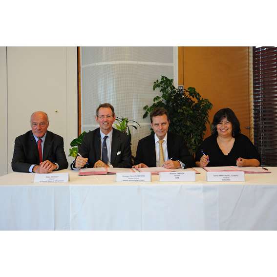 Etienne Crépon, président du CSTB, Sonia Martin Del Campo, présidente de Nobatek (basé à Anglet, 64), Georges-Henri Florentin, directeur général de FCBA (basé à Cestats, 33), et Alain Rousset, président du conseil régional d’Aquitaine, viennent de signer une convention de partenariat pour l’accompagnement des entreprises innovantes dans le domaine de la construction en Aquitaine.