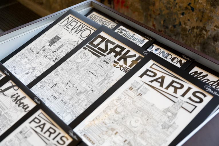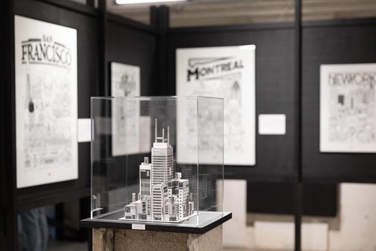 Infatigable voyageur, l’illustrateur dessine au feutre, d’un trait précis, les items des villes qu’il découvre. Architecture, trame urbaine, véhicules, ouvrages d’art ou encore enseignes publicitaires marquent la mémoire de ses pérégrinations. Et participent à livrer une vision patrimoniale de la ville. Au-delà de l’œuvre, c’est un instantané qu’il nous fait découvrir, une histoire qu’il nous raconte. Des gratte-ciels iconiques de New York au dôme géodésique de la Biosphère, à Montréal. Mais aussi, des rues étroites du vieux Paris à la célèbre “Chaussure de ski” de l’architecte Christian de Portzamparc, à Lille. En passant par le calme des bords de la Garonne, à Bordeaux à la vie trépidante du centre d’Osaka… Plus qu’une invitation aux voyages, les dessins en noir et blanc et le sens du détail de l’artiste plaident pour une pédagogie architecturale.