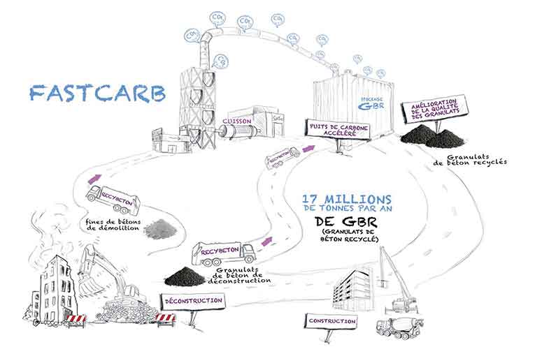 Débuté en 2018, le Projet national FastCarb a pour objectif de valider le principe de stockage du CO2 dans le béton sous forme de granulats recyclés, par le procédé de carbonatation accélérée. Ceci, pour améliorer l’impact carbone du béton. FastCarb répond aussi à l’objectif de réduction et de valorisation des déchets. En effet, les déchets “béton” du BTP représentent 17 Mt/an. Leur utilisation dans le cadre du Projet FastCarb pour le stockage du CO2 améliore leur recyclage dans les bétons, car ils sont en majorité réutilisés en tant que sous-couches routières, du fait de faibles propriétés, dont une forte porosité.