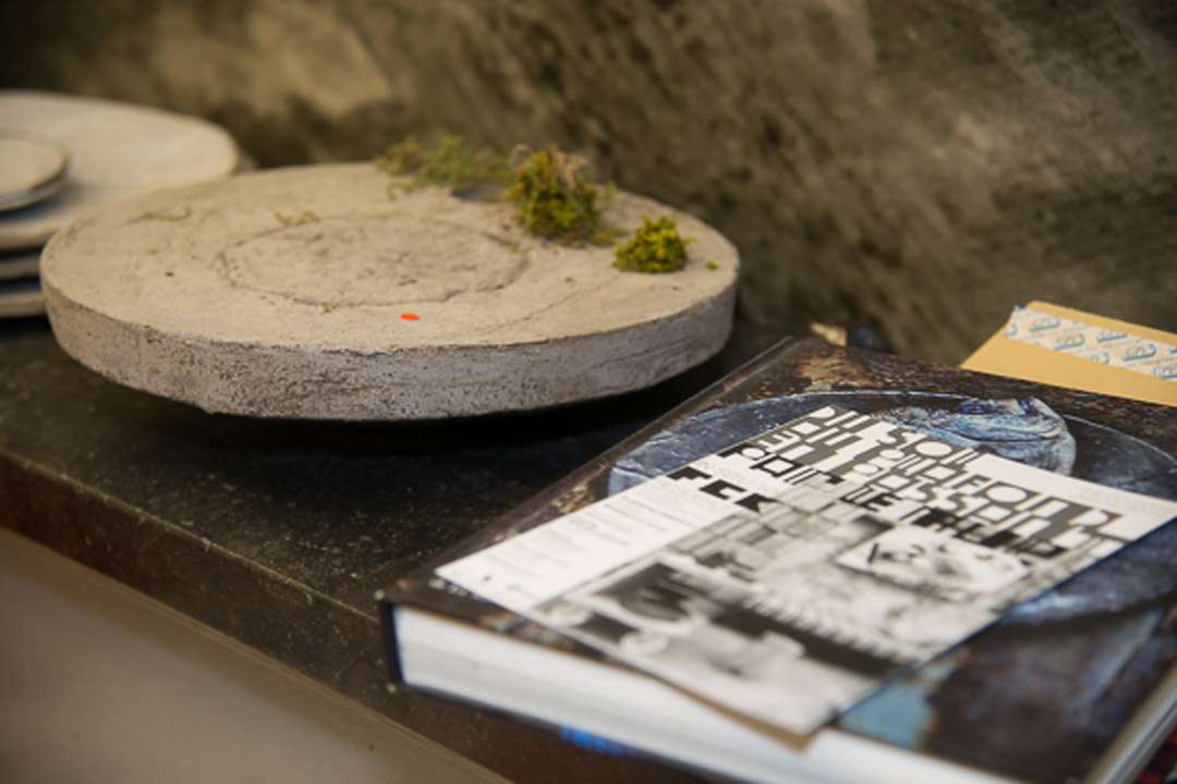 FCK a donc habité la galerie, créé des outils du quotidien (une table en béton en forme de cube ouvert sur un côté et un mur-claustra mobile en béton de 350 kg) et construit dans l’espace, en résonance avec la fonction originelle de cet ancien atelier de ganterie de 300 m2. D’où le titre de l’exposition “Du sol au plafond, en passant par le mur”. Le mur-claustra fait référence à l’architecture des années 1950-1960, à celui de Le Corbusier pour les Cités Radieuses et au brise-soleil de Jean Prouvé pour les façades des maisons tropicales. On sent les influences du Brutalisme. Frédérick Gautier a pris le temps de l’immersion. « C’est le lieu qui crée l’objet », insiste le designer. La galerie redevient un outil de fabrication que FCK construit à son tour. Avec des procédés artisanaux, il exploite des déclinaisons de matières, sculptant l’espace d’exposition.
