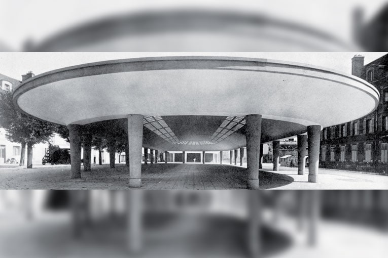 Le sénateur Jacques-Louis Dumesnil, élu à la mairie en 1935, veut alors reconstruire une halle. Il lance un concours. C’est le projet de l’architecte Henri Bard, inspiré dit-on du marché couvert de Nice, qui est retenu. Il est pourtant jugé trop onéreux et la guerre survient… A la fin de l’année 1940, la municipalité relance le projet. Son choix se porte alors sur celui de Nicolas Esquillan, un “enfant de Fontainebleau”. L’ingénieur est déjà à l’origine du pont de la Roche-Guyon, en béton armé, du pont de Clairac-sur-le-Lot… et allait être l’un des pères du futur Cnit de La Défense. C’est en trois jours d’études que Nicolas Esquillan a parachevé le plan initial de la halle, lequel fut agréé par la ville avec toutes les modifications architecturales qu’il comportait.[abonnés] Il présente l’énorme avantage de réduire les coûts en simplifiant la structure. Esquillan propose d’alléger le projet de Bard en réduisant le nombre de piliers portant la couverture et en supprimant toute la poutraison qui la reliait.