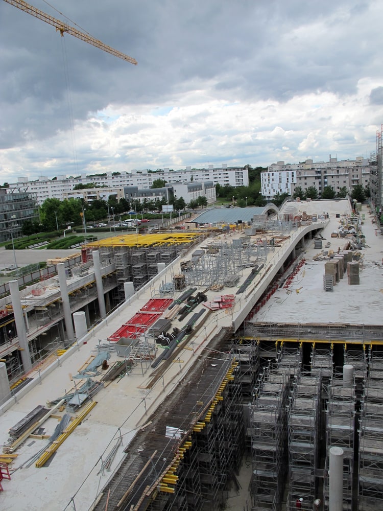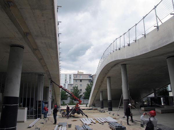 Mais, d’un point de vue architectural, c’est bien la vague de béton, au centre du complexe, qui attire l’attention. Si des réalisations en formes arrondies ont déjà été faites par le passé, très peu d’entre elles formaient des voiles en forme de S. C’est le défi qu’a été lancé à Léon Grosse et à La Française de Montage, qui ont dû inventer coffrages et phasages pour que le béton incarne le trait de crayon de l’architecte.
