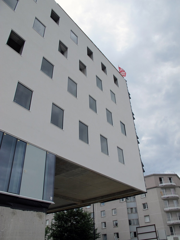 Le bâtiment s’ouvre donc par un porte-à-faux habité de 12 m, avec quatre étages sur le dos. L’originalité technique tient du fait que la façade, pourvue de nombreuses fenêtres irrégulières, ne permettait pas l’utilisation de renforts. Ainsi, c’est un prémur au maillage sur mesure qui a été mis en place, complétant un plancher alvéolaire de grande portée.