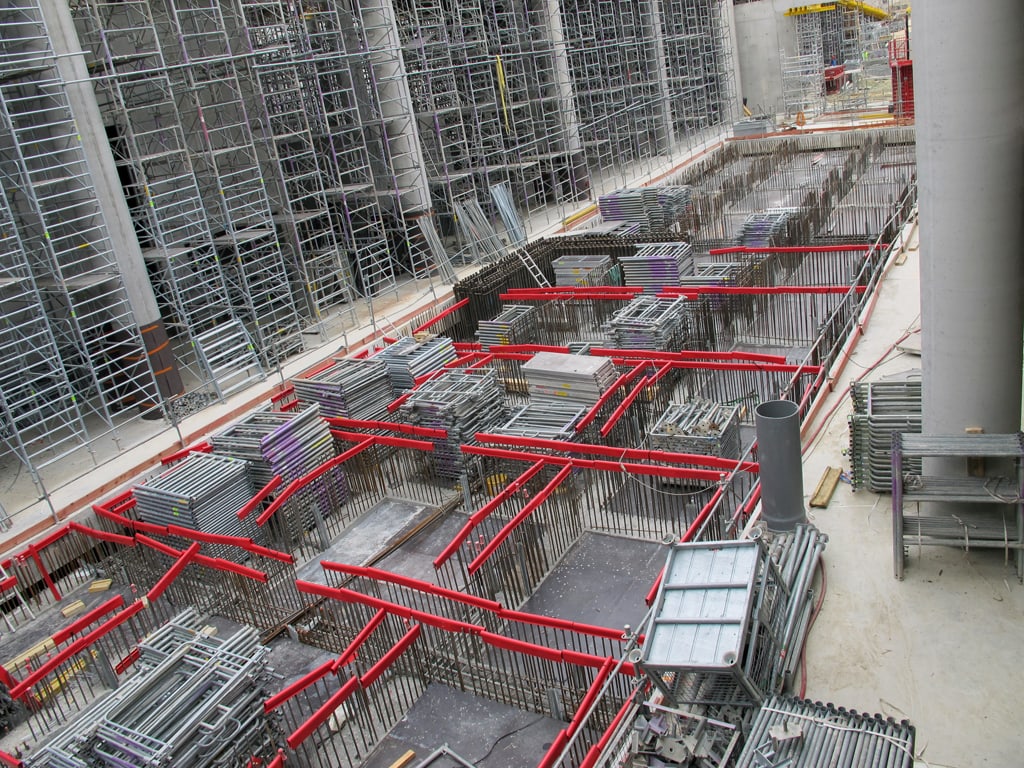 - Techniquement, la dalle ressemble à un gros sandwich. Sur les barrettes, une première dalle, dite “inférieure”, est coulée en béton C 60/75 sur une épaisseur de 40 cm. Dessus prend place un quadrillage de voiles de 5 m de haut pour une épaisseur de 60 cm.