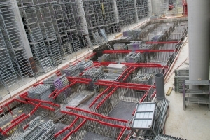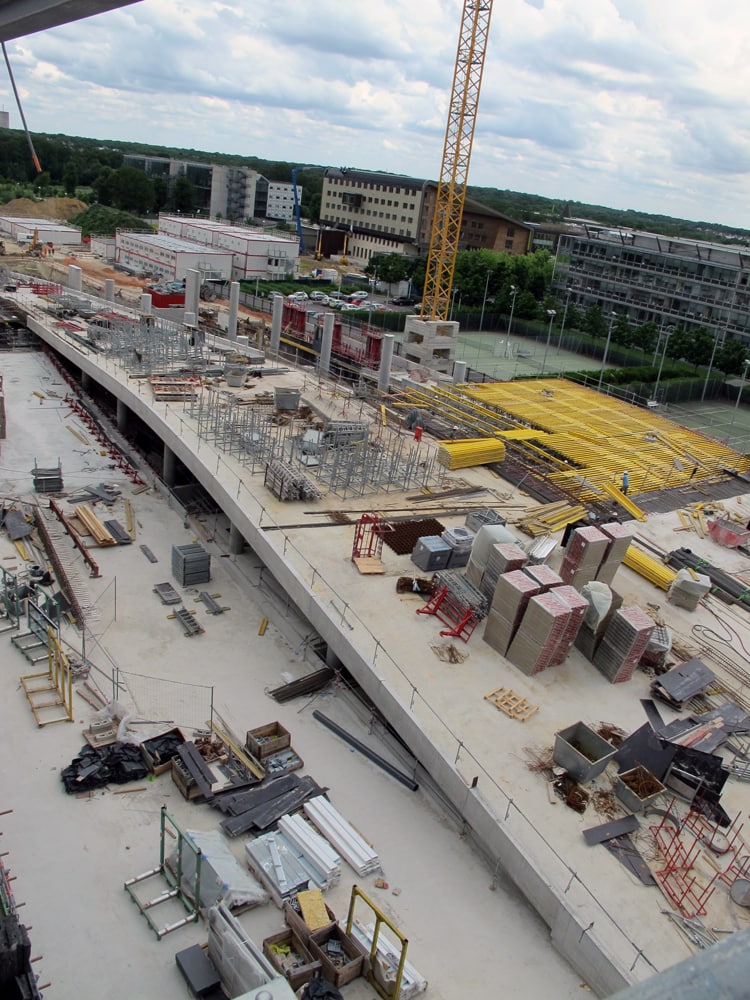 - En tout, ce sont 80 poteaux qui supportent la structure, taillant entre 70 et 100 cm de diamètre et jusqu’à 12 m de haut. La dalle ondulée, en elle-même, mesure 10 000 m2, pour 55 cm d’épaisseur, soit l’équivalent 55 000 m3 de béton de type C40/C50 couplé à 135 kg/m2 d’armatures.