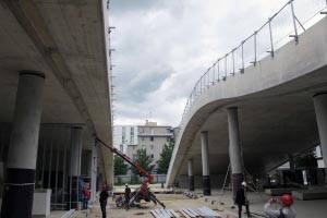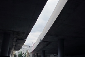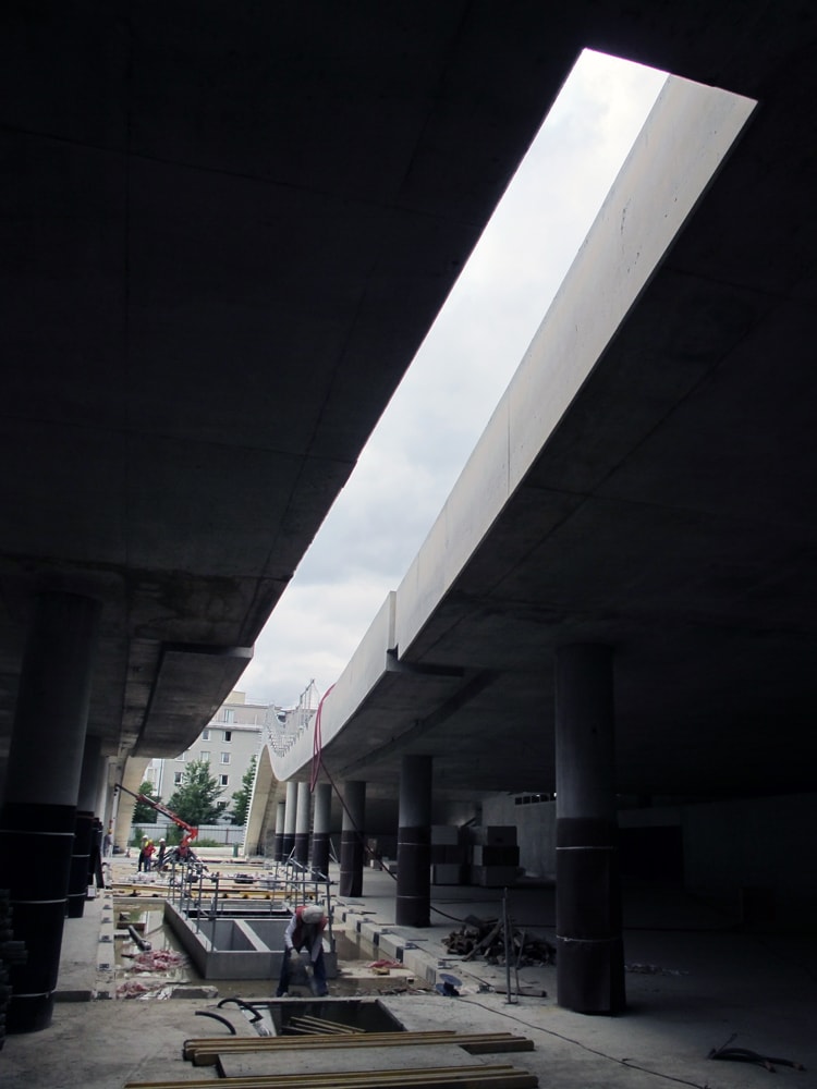 - Structurellement, la vague est supportée sur des poteaux circulaires, sans poutres. Puisque l’ensemble n’avait pas de joints de dilatation, les ingénieurs ont dû poser le tout sur des appuis glissants avec des jupes métalliques (familièrement appelés “casseroles”) sur des appuis en Téflon.