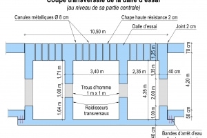 Pour effectuer leurs essais, les chercheurs de l’Ifsttar ont besoin d’une dalle qui répond à des caractéristiques techniques drastiques : un dalle supérieure de 60 m x 10 m, d’une épaisseur de 95 cm et de 125 cm, dalle qui ne doit pas bouger de plus de 1 mm. Cette dalle est complétée par un mur de réaction en L de 5 m de haut, capable de résister à une poussée de 100 t à l’endroit le plus fragile sans bouger de plus de 1 mm lui aussi.
