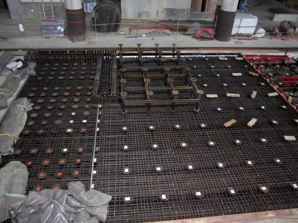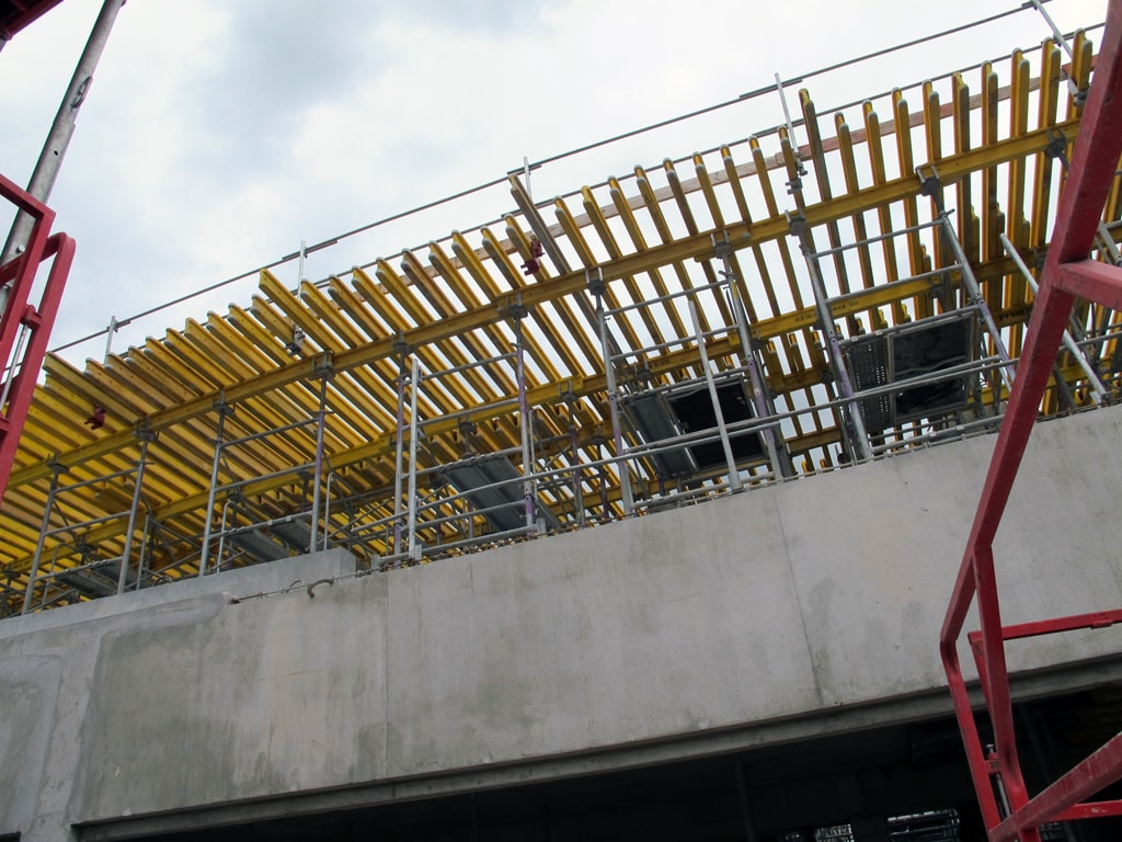 - D’une épaisseur de 95 cm, pour partie, et de 125 cm, la dalle est coulée en cinq phases, par pompage, consommant à chaque fois 120 à 150 m3 de béton. Le béton est un C 80/95 de haute volée.