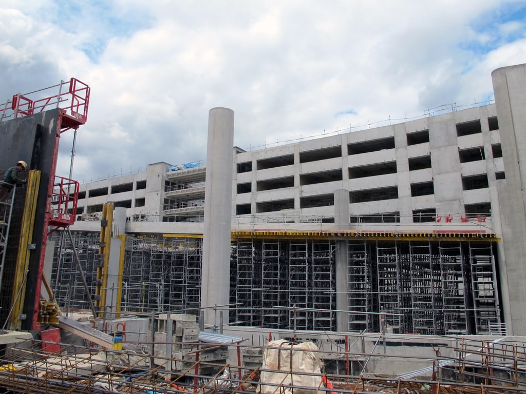 - En tout, ce sont 80 poteaux qui supportent la structure, taillant entre 70 et 100 cm de diamètre et jusqu’à 12 m de haut. La dalle ondulée, en elle-même, mesure 10 000 m2, pour 55 cm d’épaisseur, soit l’équivalent 55 000 m3 de béton de type C40/C50 couplé à 135 kg/m2 d’armatures.