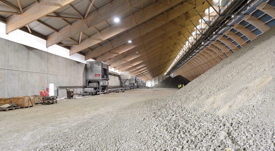 - Le hall de stockage constitue la plus imposante construction du site. Il se développe sur 242 m de long par 43 m de large. Il permet le stockage de 70 000 t de clinker, sur un tas, et, sur deux tas distincts, de 10 000 t de gypse et de calcaire.