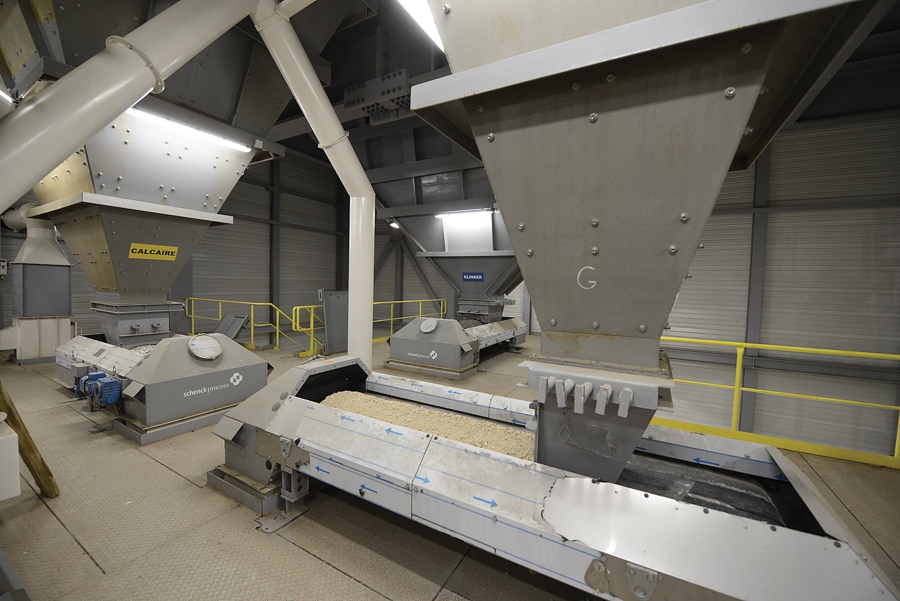 - Zone de pesage des différentes matières premières – clinker, gypse et calcaire – avant leur transfert en direction du broyeur.