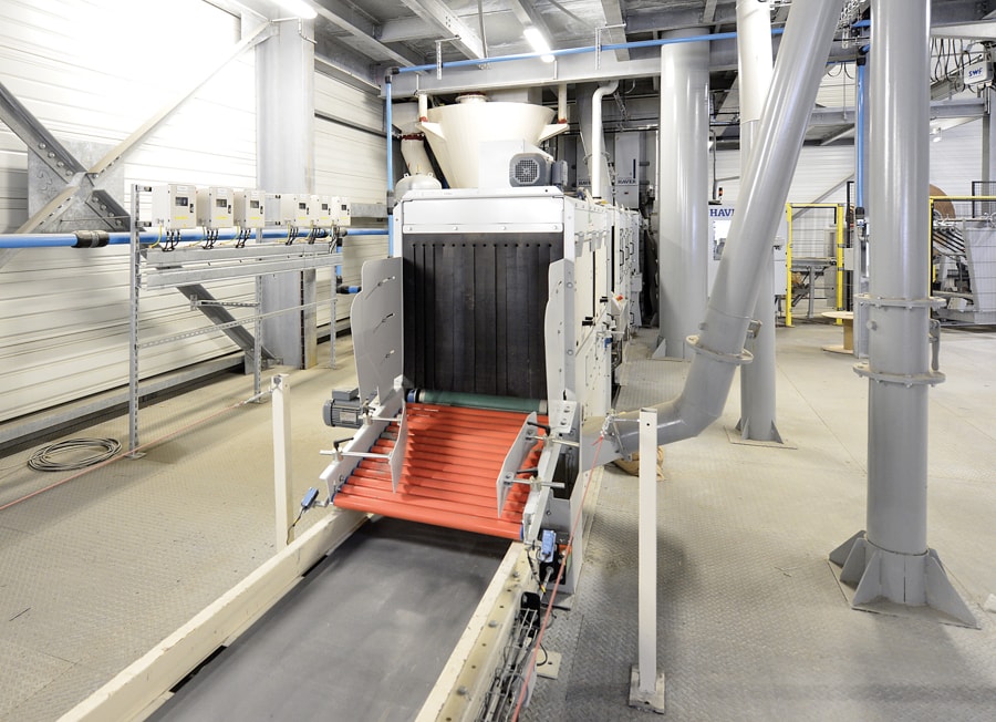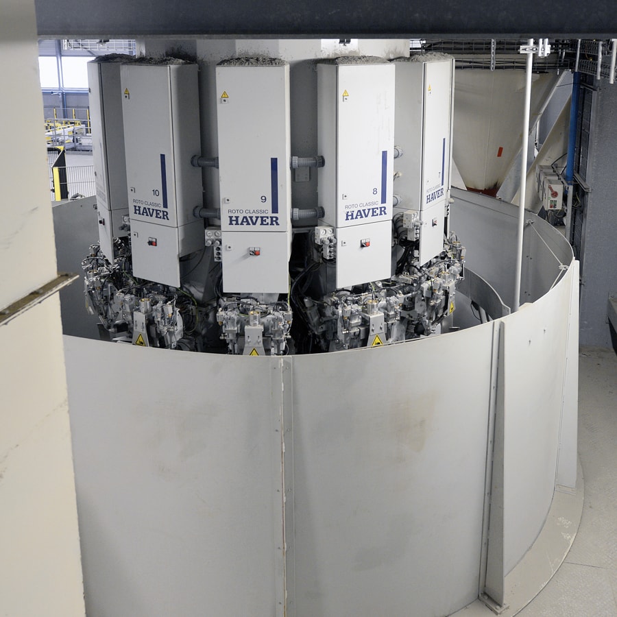 - Un tiers de la production doit être vendu en sacs. Ici, l’unité d’ensachage Haver à douze becs, d’une capacité de 130 t/h.