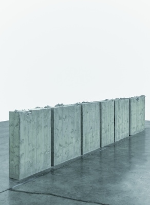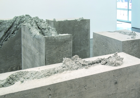 - Lara Favaretto conçoit et réalise des moules en bois dans lesquels le béton frais est coulé. Dans un deuxièmement temps, l’action s’exerce sur la matière, une fois durcie, la sculpture est démoulée. ©David Regen/Gladstone Gallery, New York and Brussels