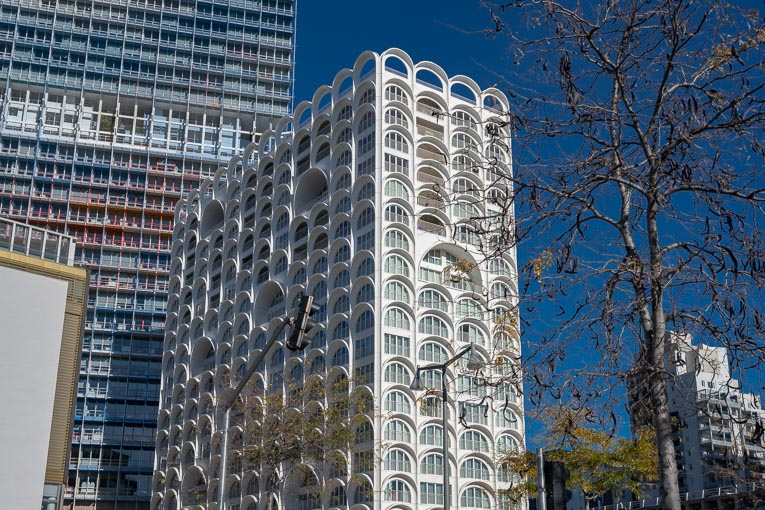 ![Les lignes courbes en béton de la Porte Bleue semblent vouloir s’opposer aux lignes droites et tendues de la tour La Marseillaise.