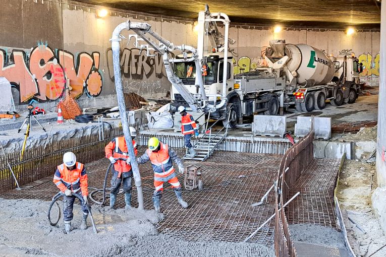 La construction d’une passerelle en béton sur la place du Trocadéro, à Paris (projet porté par Multipompage). [©Multipompage & SNPB].