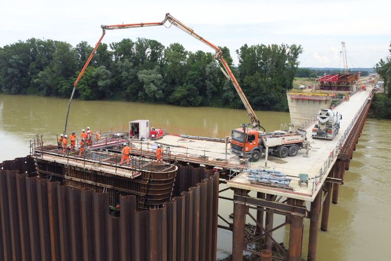 Le chantier “Barreau de Camelat” avec la construction de deux ponts sur la Garonne et son canal latéral (projet porté par Lafarge Aquitaine). [©Lafarge Aquitaine & SNPB].