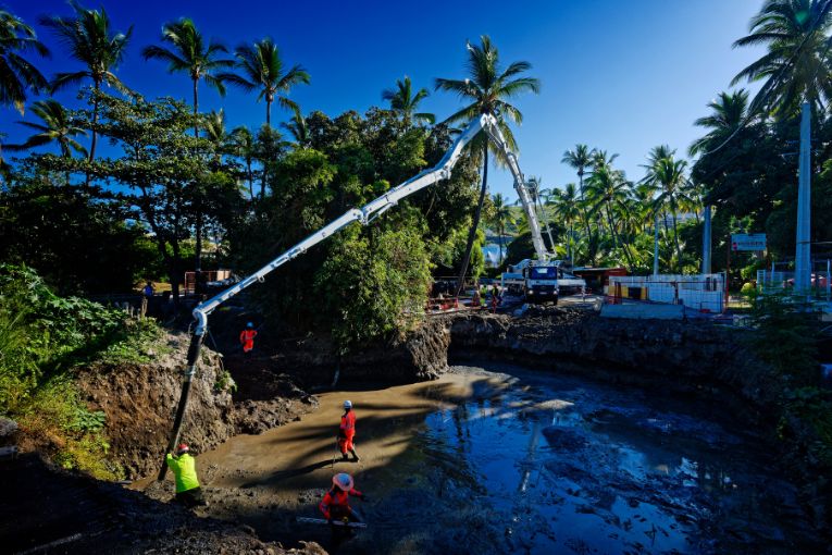 · Le coulage d’un fonds de fouille, à Saint-Gilles-les-Bains, sur l’île de La Réunion. Projet porté la société Teralta.