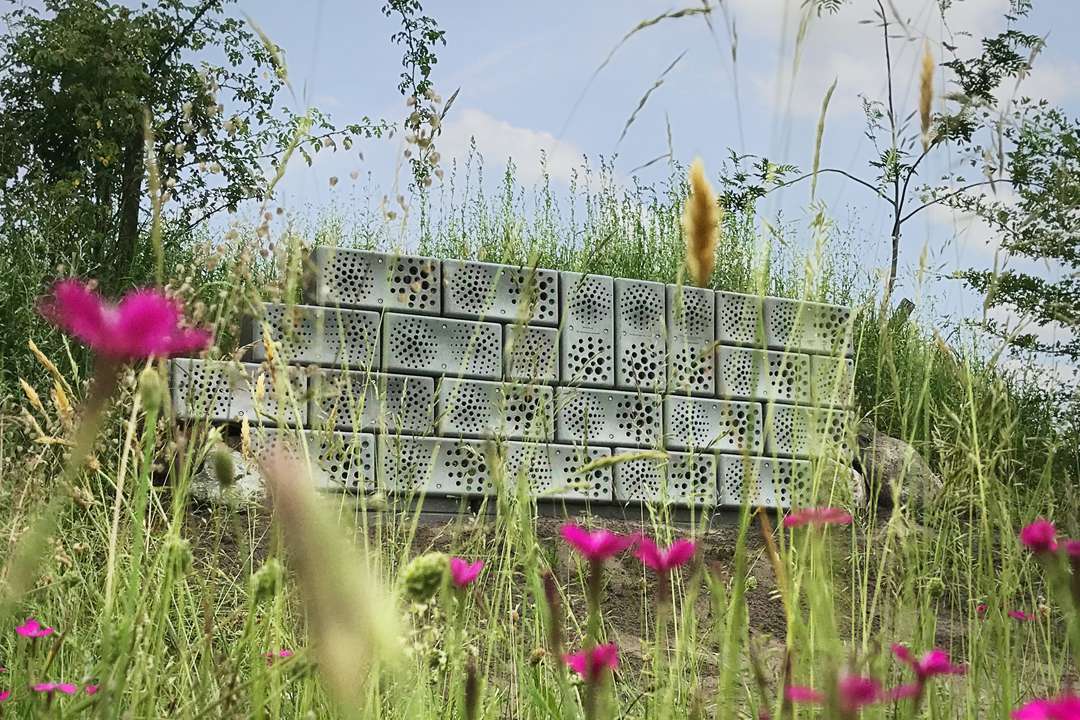Ces “hôtels” sont constitués d’un élément de base en béton avec deux cavités et une façade en béton avec des trous de taille différente, entre 2 mm et 14 mm de large, et jusqu’à une profondeur de 150 mm. Les cavités sont remplies de “noyaux”. Un noyau est une boîte en carton remplie de matériaux de nidification, tels que du roseau, du bambou ou du terreau. Ce principe est destiné à fournir un abri à toutes sortes d’insectes, mais surtout les abeilles solitaires. En raison de sa masse, le béton se réchauffe lentement, mais conserve aussi sa chaleur pendant une longue période. Du coup, c’est tout un mur, qui peut devenir un lieu de nidification. L’ouverture des trous en façade empêche les oiseaux dévoreurs d’insectes de piller les nids. Pour le moment, on trouve surtout ces architectures aux Pays-Bas, mais « Nous espérons que dans quelques années, nos hôtels seront partout ! »