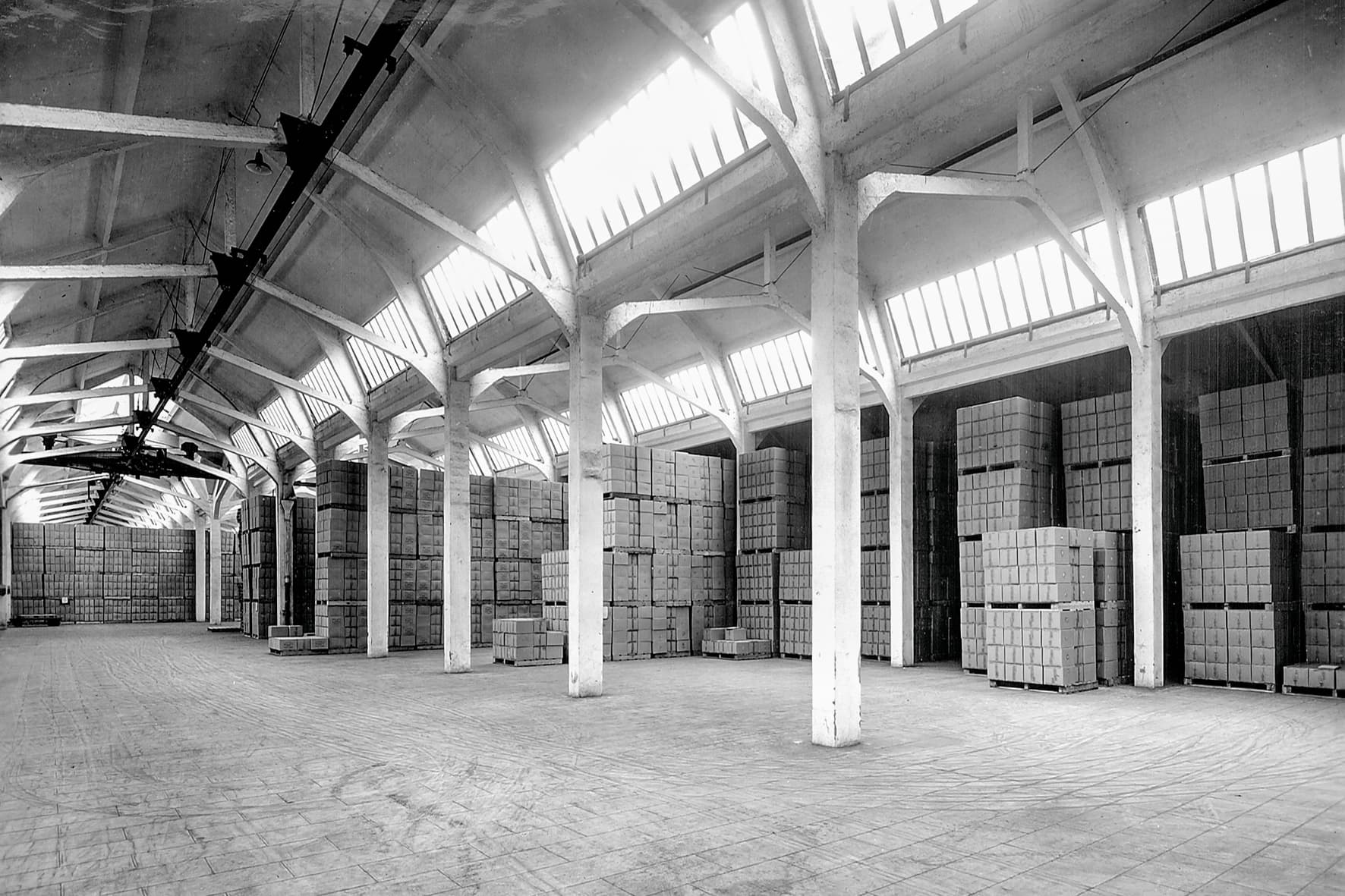 L’ensemble industriel définit une vaste composition urbaine. Là s’insèrent différents ateliers à l’écriture architecturale homogène en béton. Des passages couverts inspirés de ponts dits “en bow-string” relient certains d’entre eux. Une seconde phase de travaux est