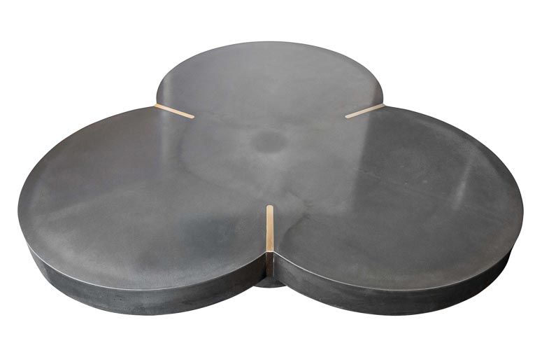 Ainsi, le piètement et le plateau à trois pétales de la table basse “Clover” sont coulés ensemble.Les inserts en laiton viennent sublimer les pétales, et apportent délicatesse et raffinement à cet imposant meuble. Le dessin de la table “Nervure” reprend, elle, de façon stylisée, celui des nervures d’une feuille ou celles constituant les ailes d’un avion. Ainsi naît le contraste entre le dessin aérien et le matériau brut.