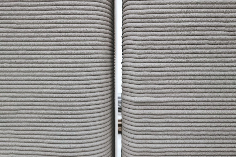 Vient ensuite la deuxième étape, celle de l’extrusion et de l’impression. Elle est assurée avec l’aide de l’activateur MasterSet 3D 1010 qui est injecté dans le mélange dès lors que l’encre minérale passe par la tête d’impression. Ce qui induit un changement immédiat de consistance et une thixotropie1 élevée, garantissant la stabilité des couches successives. Enfin, la phase de prise et de durcissement est optimisée. Le temps de prise est réduit et le développement des résistances mécaniques est accéléré. Ce qui engendre une rapidité d’impression pour chaque couche, sans que l’ensemble ne s’affaisse.