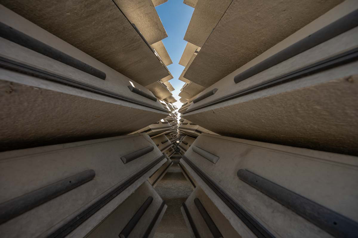 Empilés, les voussoirs forment comme des sculptures abstraites, en laissant transparaître qu’un fragment du bleu céleste. Ces éléments semblent figés dans le temps et dans l’espace. Mais l’impression est fausse, sachant qu’ils ne vont pas tarder à rejoindre leurs emplacements dans les tunnels des lots 3 ou 4 de la ligne C du métro de Toulouse.