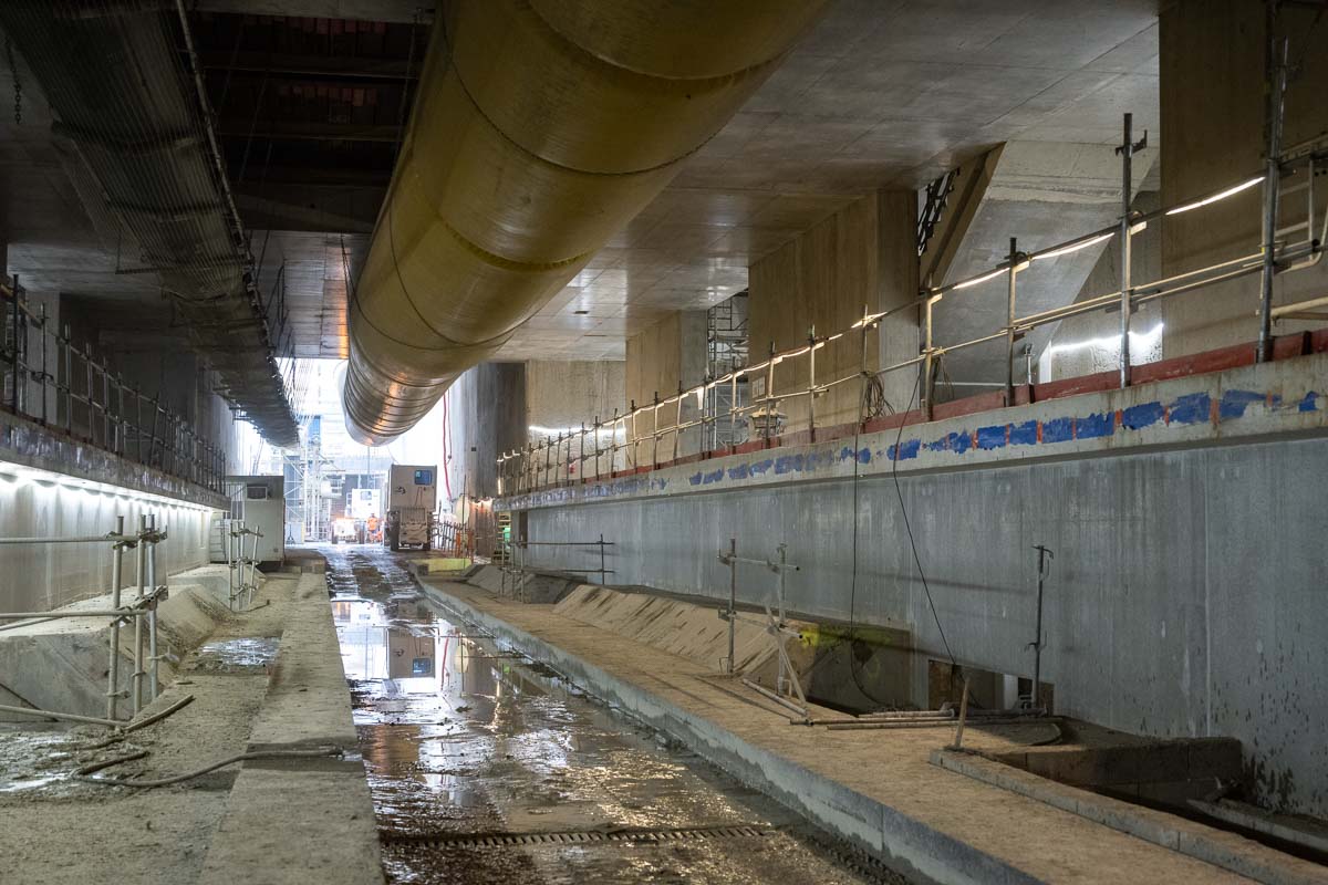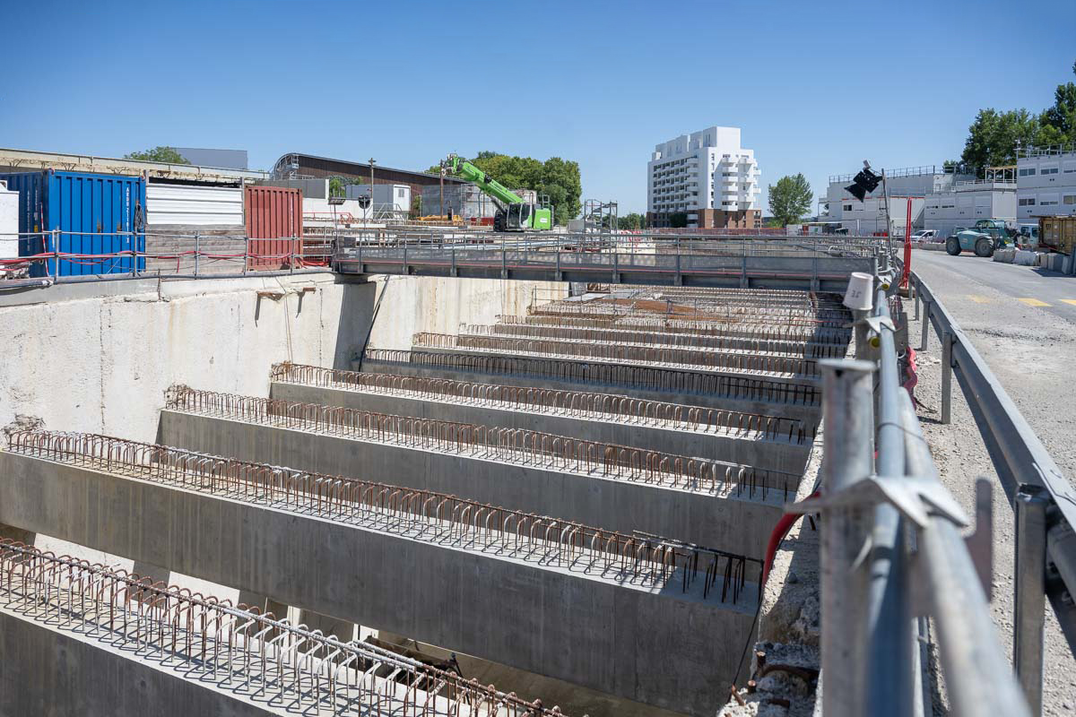 Un promontoire – en réalité, la terrasse des bureaux de chantier – offre une vue plongeante sur la future station Montaudran Gare et la tranchée couverte qui la prolonge. Situé à mi-parcours du tracé de la ligne C, le lot 4 est l’occasion d’un petit focus sur l’approche environnementale des travaux de construction. En effet, si le béton à empreinte carbone réduite n’est pas le sujet du projet dans son ensemble – celui-ci a été initié bien en amont de ce type de préoccupations -, dix-neuf thèmes HQE ont tout de même été identifiés. Un tiers concerne les bétons des voussoirs et les armatures. Un tiers la construction des stations, des puits d’accès et de la tranchée couverture. Et un tiers, les systèmes de transport et de logistique. A ce niveau, par exemple, les machines de chantier profitent d’un carburant de type HVO (pour un volume total de 720 m3). Et quelque 300 000 t de terres d’excavation ont trouvé un nouvel usage sur le chantier de l’autoroute A69 (ex-A680).