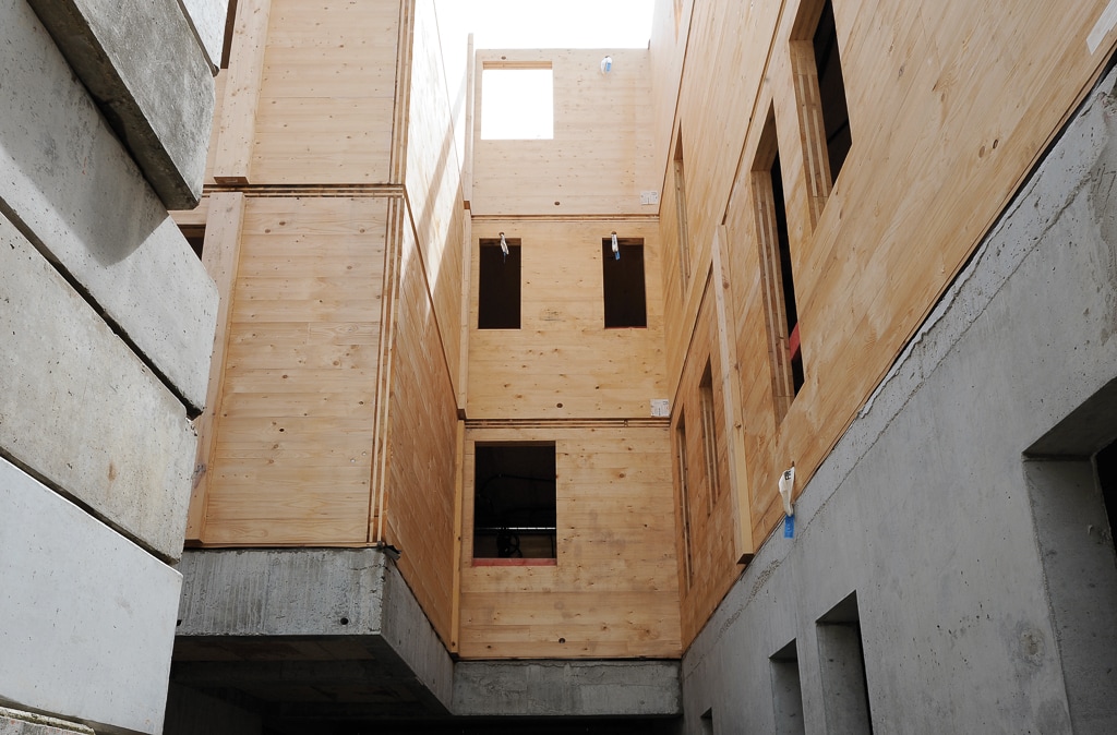 - Deux noyaux en béton, enfermant les cages d’escaliers et d’ascenseurs, participent au contreventement du bâtiment (un seul noyau est visible sur la photo). [©Laurent Blossier/Metsä Wood]