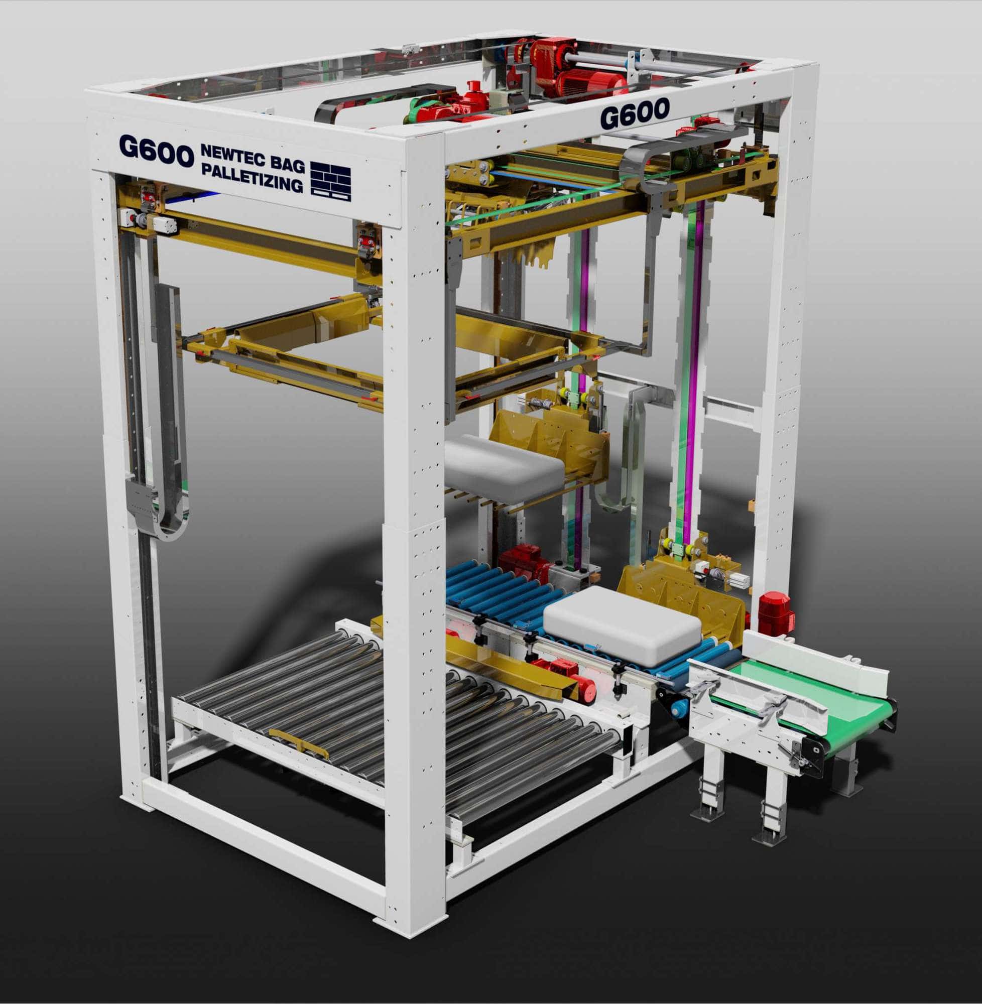 Newtec présente au Salon de l’emballage du 17 au 20 novembre 2014, et en avant-première mondiale, son nouveau G 600. Un palettiseur de dernière génération. Il a été spécialement développé pour les clients n’ayant que peu d’espace ou ne nécessitant qu’une capacité de travail intermédiaire. Basé sur le schéma du G 300 qui a fait ses preuves, le G 600 s’est vu offrir deux ascenseurs pour convoyer les sacs, augmentant d’autant sa vitesse.