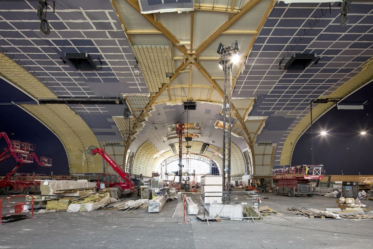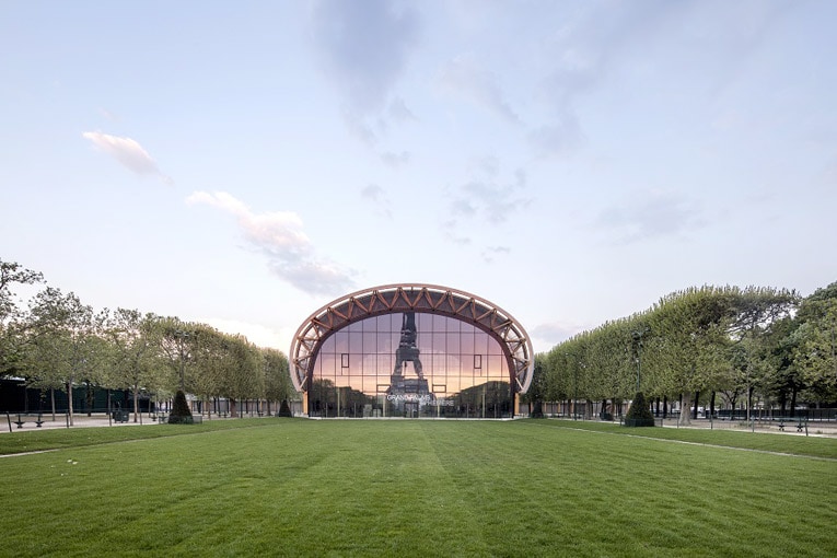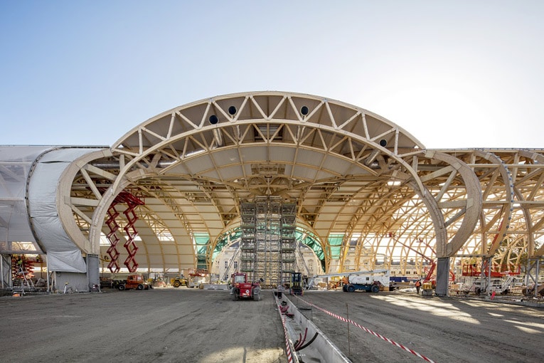 En effet, le bâtiment peut se monter et se démonter facilement. Sa charpente courbe en double voûte est en bois et préfabriquée en atelier. Sa nef principale a ainsi une portée ininterrompue de 51 m dans la largeur et de 33 m dans la profondeur. Sans poteau ni élément structurel interrompant l’espace. Les 44 arches monumentales du Grand Palais Ephémère ont pu être assemblées sur place dans un délai de trois mois.