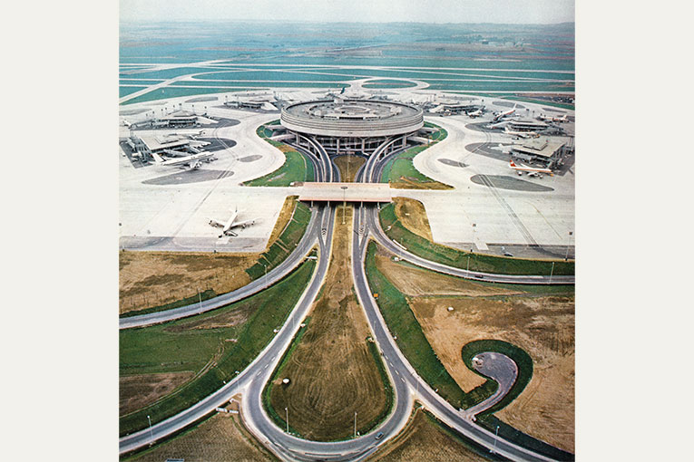 Mais tout commence quand il se voit confier, à l’âge de 29 ans, la conception de la nouvelle aérogare 1 de Paris-Nord, futur aéroport Roissy – Charles-de-Gaulle (1967-1974). Un projet ambitieux, marquant. La masse cylindrique de béton opaque, accompagnée de tubes de circulation distribuant des terminaux en satellites, devient l’emblème de la modernité. A l’intérieur, les espaces spacieux et lumineux et leurs organisations facilitent physiquement et “psychologiquement” les déplacements des voyageurs. Après le Terminal 1, Paul Andreu engage le chantier de construction du Terminal 2, entre 1969 et 1982. Puis, entre 1985 et 1993, avec un concept innovant : proposer une architecture évolutive pour permettre de faire face aux futurs besoins d’agrandissements.