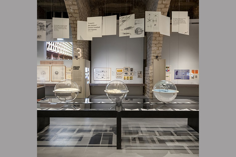 On découvre en entrant dans l’exposition, agencée tout en longueur, une première partie avec la donation de 69 croquis de l’architecte. Cette section sépare, sous la forme d’une vitrine géante, en deux la salle principale. Véritable colonne vertébrale de son approche phénoménologique de l’architecture. Et de part et d’autre, dans des alvéoles, ses différentes contributions architecturales sont mises en valeur.