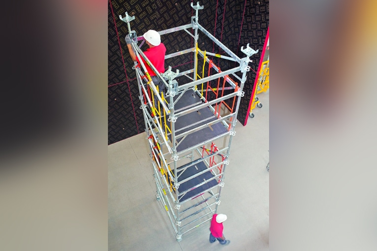 La nouvelle tour d’étaiement Peri UP MDS est équipée d’un nouveau concept de plateaux suspendus aux lisses de garde-corps apportant un montage en réelle sécurité, une nouvelle mise en œuvre de la sécurité dans la tour et une réduction notable à l’exposition aux troubles musculo-squelettiques (TMS). L’accrochage du plateau suspendu aux lisses de garde-corps rend obligatoire le positionnement des plateaux à 1 m sous la lisse. Les plateaux suivent en permanence la tête de la tour, leur évolution est spontanée, continue et constante. L’obligation de la manipulation depuis le haut modifie l’installation de la sécurité à l’intérieur de la tour.