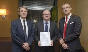 Hervé de Maistre, directeur général de Placoplatre, Philippe Yvin, et Laurent Mogno, prestataire pour le compte de Placoplatre. [© Société du Grand Paris / Axel Heise]
