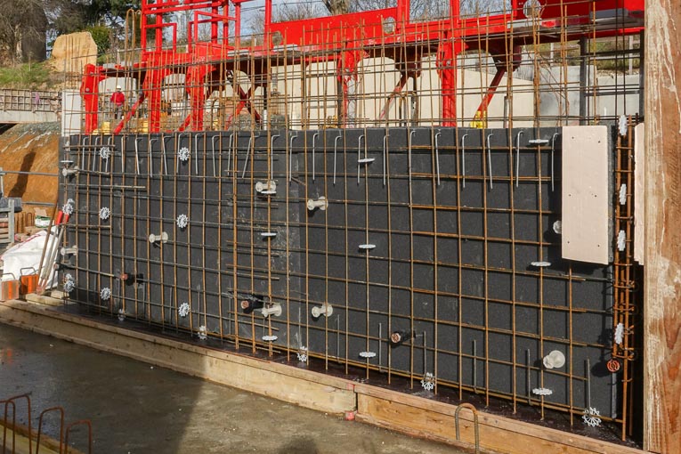 En ce qui concerne son utilisation, le procédé GBE était simple d’emploi pour Bertrand Duron Constructeur. Grâce à ce système innovant, ce dernier, en charge du gros œuvre, a pu réaliser des murs d’enceinte. « A l’aide de nos dagues et de nos connecteurs GBE, l’entreprise a pu couler en place un mur sandwich. Celui-ci intègre un isolant entre les deux parois en béton. » Sur ce chantier, l’isolant n’est autre que le polystyrène expansé (PSE) de Hirsch Isolation. « Nous avons livré des panneaux PSE de grandes dimensions, souligne Amaury Omnes, directeur général de Hirsch Isolation. Ils mesurent 2,50 m de hauteur, 1,20 m de large et 22 cm d’épaisseur. Cela a permis de limiter le nombre de pièces GBE. Et ainsi d’offrir un gain de temps pour les compagnons. De plus, la performance thermique est au-delà des exigences imposées par le RE 2020, avec une résistance thermique de 7 m2.K/W, au lieu de 5. »