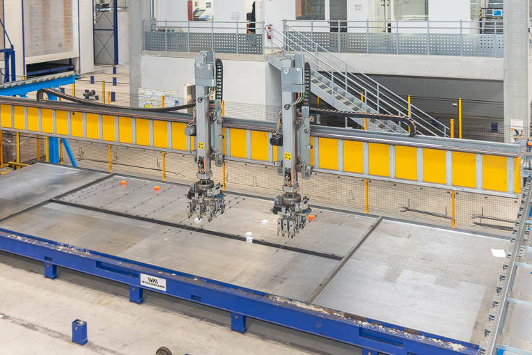 Toute la nouvelle unité de production s’articule autour d’un carrousel, dont les tables mobiles constituent les éléments centraux. Ce sont elles qui déterminent la capacité de l’usine. Rector a fait installer 48 tables de 3,90 m de large pour 12,80 m de long. Des équipements issus de l’offre Weckenmann, qui a aussi fourni la machine de bétonnage, l’étuve avec son ascenseur et le poste de décoffrage des prédalles. L’autre grand partenaire est Vollert qui, lui, a installé le robot de coffrage/décoffrage, la totalité du retourneur et le système de mise à la verticale des tables pour le décoffrage des MCI. Enfin, la ligne “armatures” est signée Progress. « En fait, il y a deux lignes de préparation/préfabrication des armatures : une pour les prédalles et une pour les prémurs. Elles fonctionnent en parallèle », reprend Thierry Boutonnet.