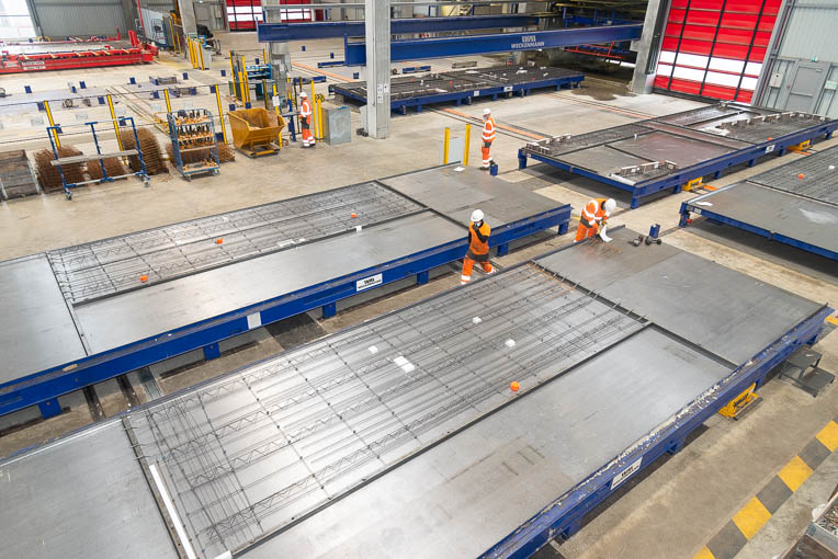 En termes d’organisation de la production, les lignes “prédalles” et “MCI” sont communes sur une partie du cheminement et spécifiques sur une autre. Ainsi, le coffrage des règles, le bétonnage et le décoffrage/nettoyage constituent une ligne unique. Celle-ci se divise en deux au niveau des postes d’armatures, de retournement ou encore de l’évacuation des éléments finis.