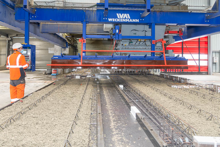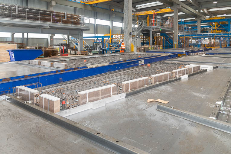 La nouvelle halle est 100 % dédiée à la préfabrication de prédalles et de murs à coffrage intégré (prémurs). La production a démarré en mai 2020, en plein premier confinement Covid… Elle concernait les prédalles. Les MCI ont suivi à partir de septembre. « L’unité offre une capacité de 500 000 m2/an d’éléments de planchers, en 3 postes », reprend Thierry Boutonnet. Mais pourquoi une telle superficie ? L’idée est d’avoir un outil mixte, en mesure de répondre aussi bien à la demande en prédalles qu’en MCI, sans risque de saturation immédiate.