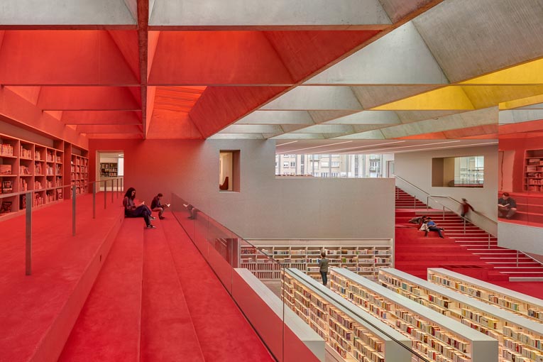 « J’ai fait le choix d’un béton relativement simple, clair, brut de décoffrage, mais sans joints. Les poutres forment des carrés et des rectangles, et la verrière est en électro-chrome, sensible à l’intensité de la lumière. Certaines parties réagissent et s’illuminent en rouge, d’autres en jaune. Ces ambiances sont projetées sur le béton, ce qui les met en valeur. C’est un dialogue entre les matières et la lumière. » Ici, le béton sert de support aux jeux de lumière, alors que le sol, lui aussi en béton, apporte une certaine « tension en plus. Les effets se répondent ». Le béton apporte aussi ses qualités acoustiques. « Les différents lieux sont assez ouverts. Nous avons dépassé les exigences acoustiques pour permettre, par exemple, aux enfants de profiter de leur espace, sans gêner une conférence qui aurait lieu un plus loin. »