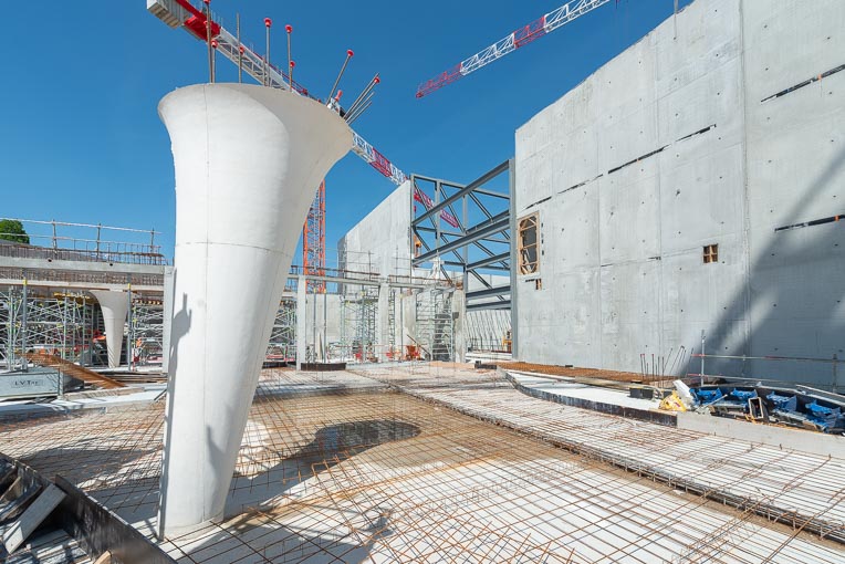 La toiture du bâtiment est prévue en charpente métallique, recouverte de bacaciers double peau et végétalisée. Les façades, elles, recevront quelque 5 000 m2 de vêture constituée d’un assemblage de 2 000 panneaux de 1,60 m x 1,60 m en Ductal. Ces éléments sont aujourd’hui en cours de production au sein des usines Delta Préfabrication, en Ardèche, et Taporo, dans l’Yonne. La pose des premiers panneaux doit intervenir dans le courant de l’été.