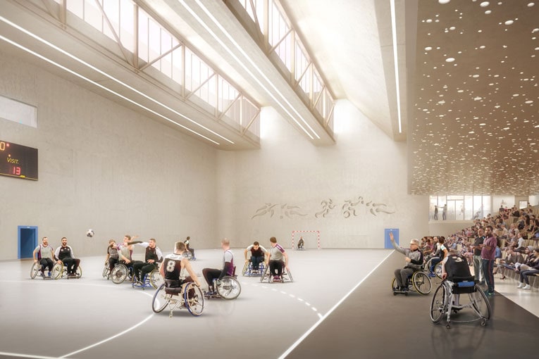 En un même lieu, la construction regroupe une multitude d’activités. Dont la première est un centre sportif s’articulant autour de deux salles homologuées. Qui seront dédiées à l’entraînement et aux compétitions de handball, de basket, de volleyball ou encore de badminton. Murs d’escalade, salle d’armes, de musculation, dojo… complètent le dispositif. Prisme intègre aussi un pôle médical et de recherche. Et un autre, de ressources (bureaux pour fédérations sportives, salles de formations et de séminaires). Dans les faits, le lieu sera accessible à tous les publics, qu’ils souffrent de handicaps ou non. Et pourra accueillir jusqu’à 1 500 usagers en même temps.