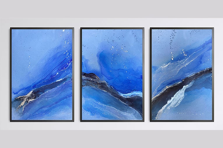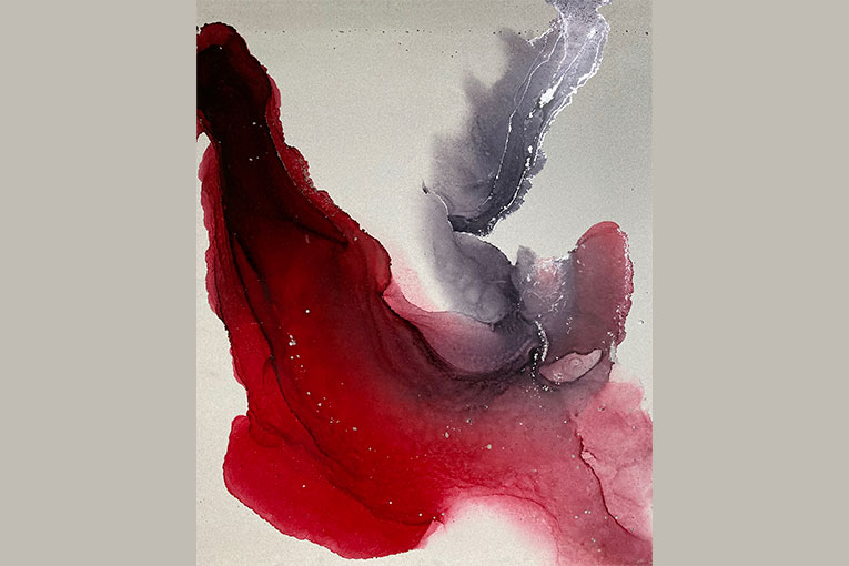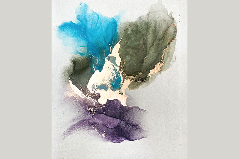 Graphiste et directrice artistique depuis plus de trente ans, Jen se sert de son expérience pour créer des tableaux tout en légèreté. Des œuvres abstraites, contemporaines, lyriques, où chacun verra ce que son esprit lui suggère : la terre vue du ciel, des voiles qui volent, des visages, des oiseaux… Une fois cassées, déstructurées, certaines plaques de béton sont réassemblées façon kintsugi. Cet art japonais qui célèbre l’imperfection, en utilisant de l’or pour réparer les objets. L’artiste utilise des encres teintées à alcool sur des plaques de béton colorées. Ces encres vont ainsi se mélanger et créer des tableaux abstraits, toujours originaux. C’est ce qu’on appelle le “Fluidart”.